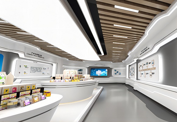 時間:2022年3月-5月。城市:山東青島。 設計思路:蘭化所展館以白色為主基調,輔以淺藍色點綴,營造清新、明亮的展示環(huán)境。墻面采用白色,搭配淺藍色裝飾條和展示架,凸顯蘭化所的科技感和未來感。 -