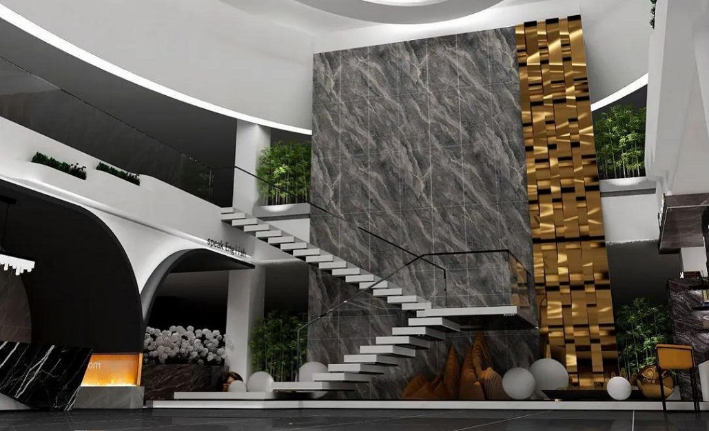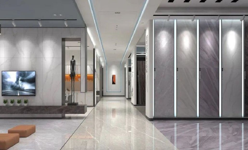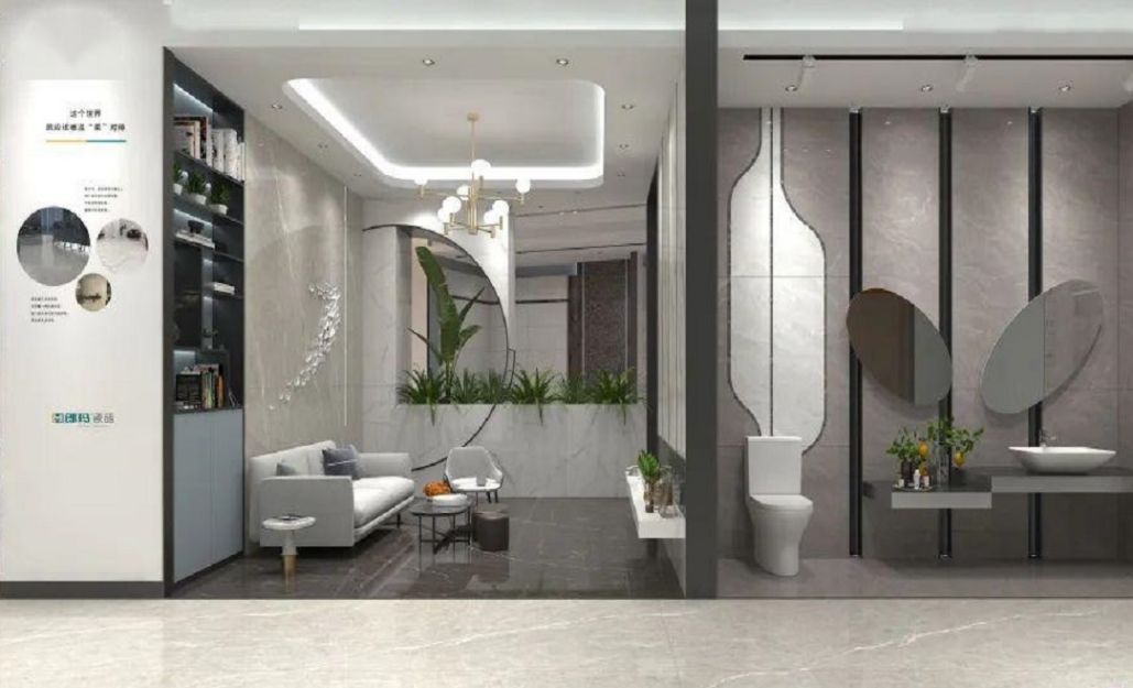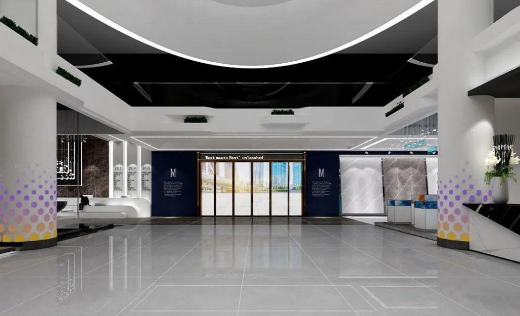 設(shè)計思路:展廳整體以銀白色為主色調(diào),通過大面積的銀白色墻面、地面和展示架,營造出純凈、高雅的氛圍。選擇表面光澤度高的銀白色瓷磚作為展示材料,展現(xiàn)瓷磚的質(zhì)感和光澤。同時,可搭配少量黑色或灰色元素,形成色彩對比,突出展廳的現(xiàn)代感。