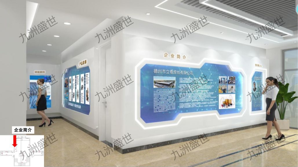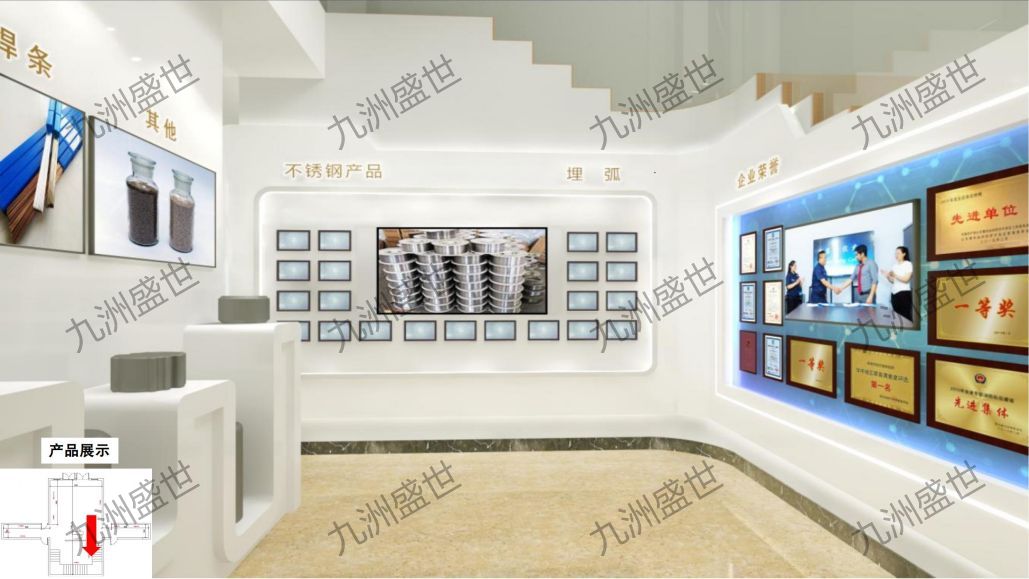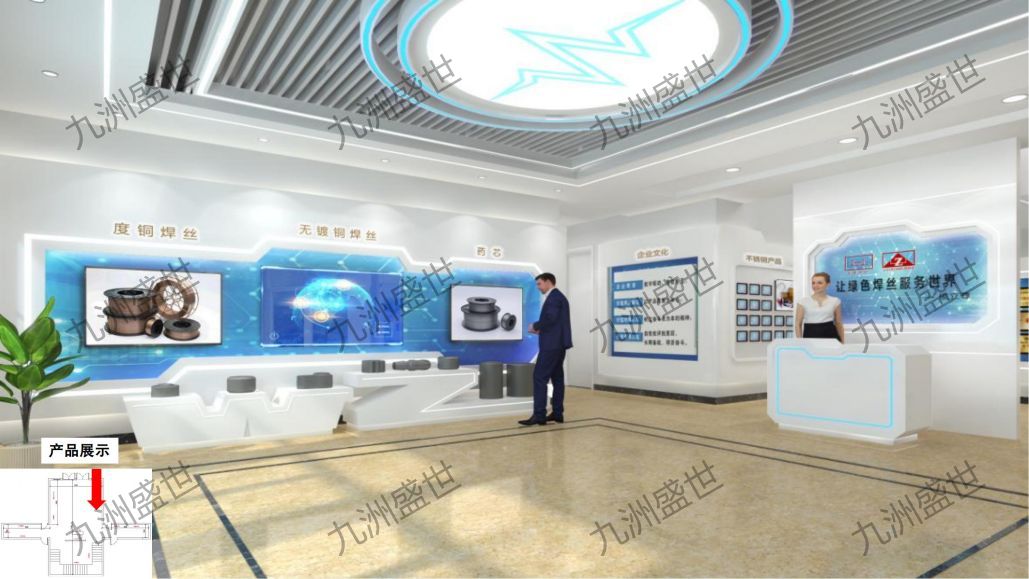 設計思路:立尊焊絲展館采用白色與淺藍色相融合的設計,營造簡潔、明亮的展示空間。白色墻面與淺藍色展示架相映成趣,搭配專業燈光,凸顯立尊焊絲產品的精致與高端。