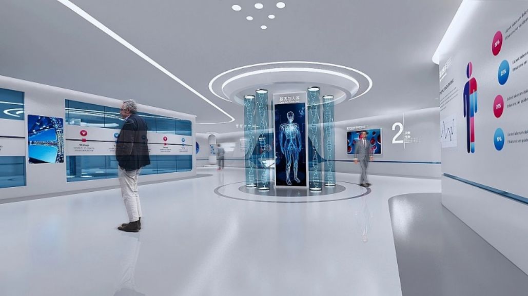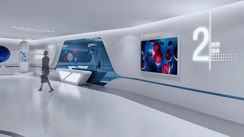 城市:山東菏澤,時間:2020年6月-9月。設計理念:展廳布局簡潔,白色為主,藍色點綴,聲光電演繹生命奧秘,展示企業細胞生命科技實力。