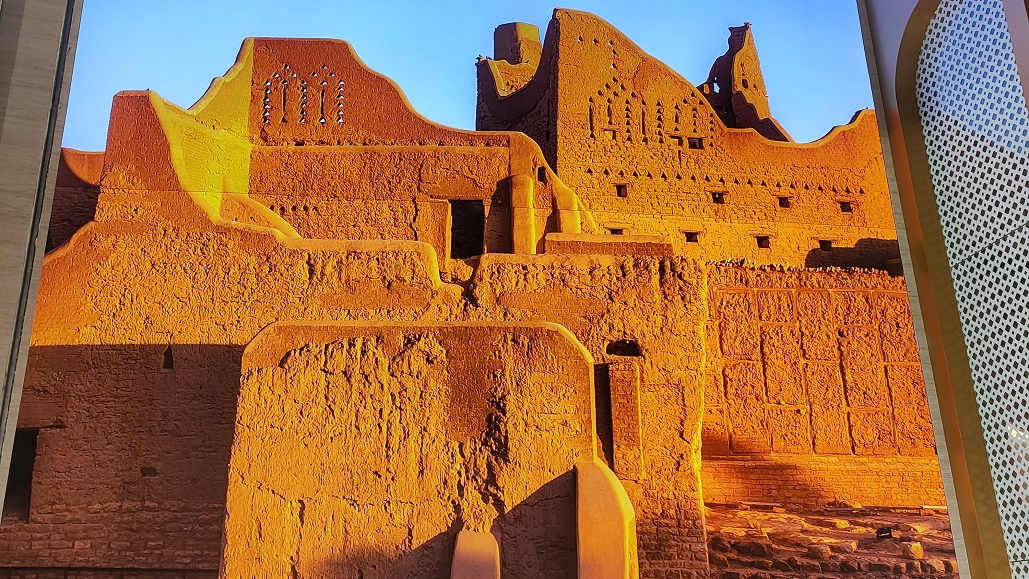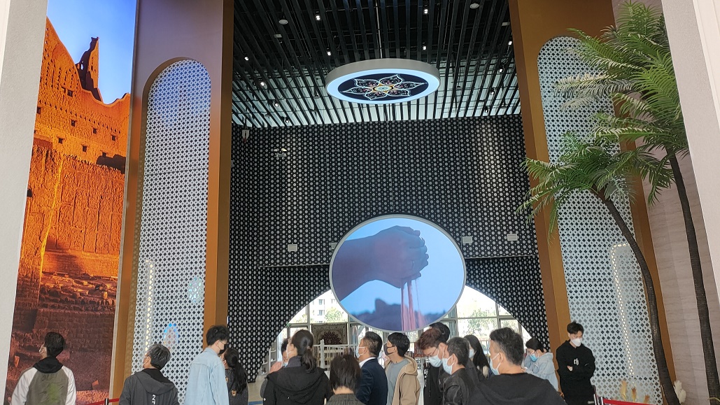 城市:山東青島,時間:2022年5月-8月。設計理念:沙特國家館布局典雅,土黃色為主調,色彩絢麗,布局合理,聲光電結合,凸顯國家特色