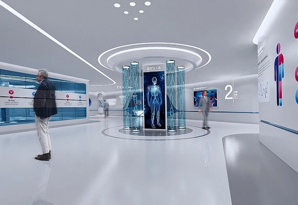 城市:山東菏澤,時間:2020年6月-9月。展廳布局簡潔,白色為主,藍色點綴,聲光電演繹生命奧秘,展示企業細胞生命科技實力。 -